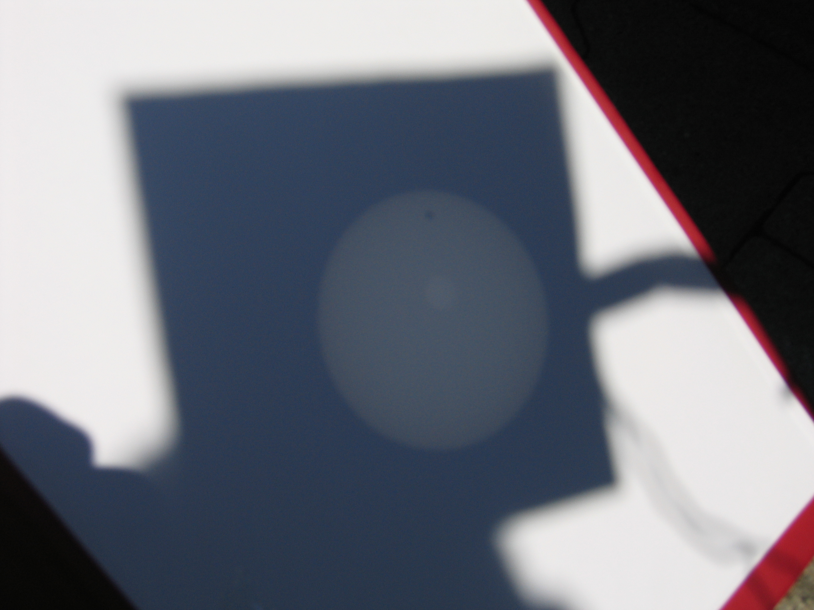 Ein Papier um das Okular (wo man sonst reinguckt) wirft einen Schatten auf den Block. Im Schatten erscheint ein Bild der Sonne.